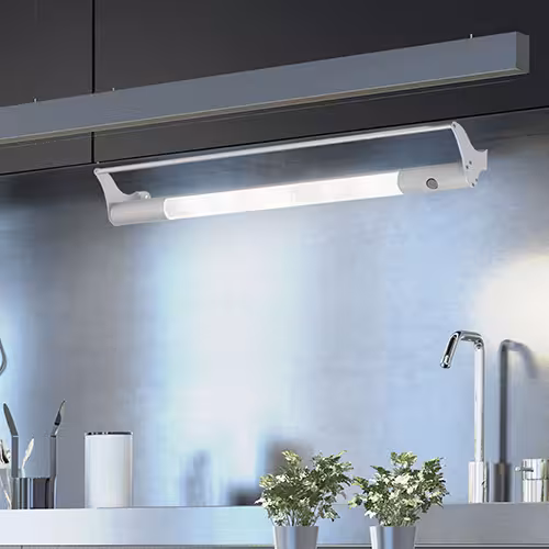 Nad kuchenką lub zlewozmywakiem: modele z obrotowym ramieniem i osłoną przeciwbryzgową oświetlają trudno dostępne miejsca.
