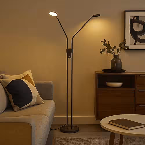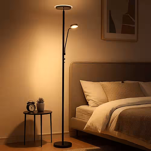 Szczególnie praktycznym modelem są lampy podłogowe z dwoma źródłami światła: Światło główne, znane również jako lampa sufitowa, które oświetla pomieszczenie, oraz elastyczna lampka do czytania. Pozwala to na połączenie oświetlenia bezpośredniego i pośredniego w jednym urządzeniu - oszczędzającym miejsce i niezwykle funkcjonalnym.