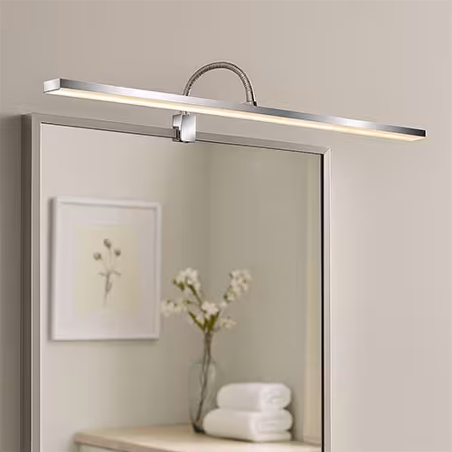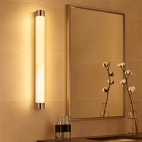- Oświetlenie lustrzane: Modele te montowane są bezpośrednio nad lustrem lub obok niego. W szczególności oświetlenie lustra LED zapewnia równomierne, pozbawione cieni oświetlenie podczas nakładania makijażu, golenia lub mycia zębów. Wiele z nich jest kompaktowych, nieoślepiających i nowocześnie zaprojektowanych.